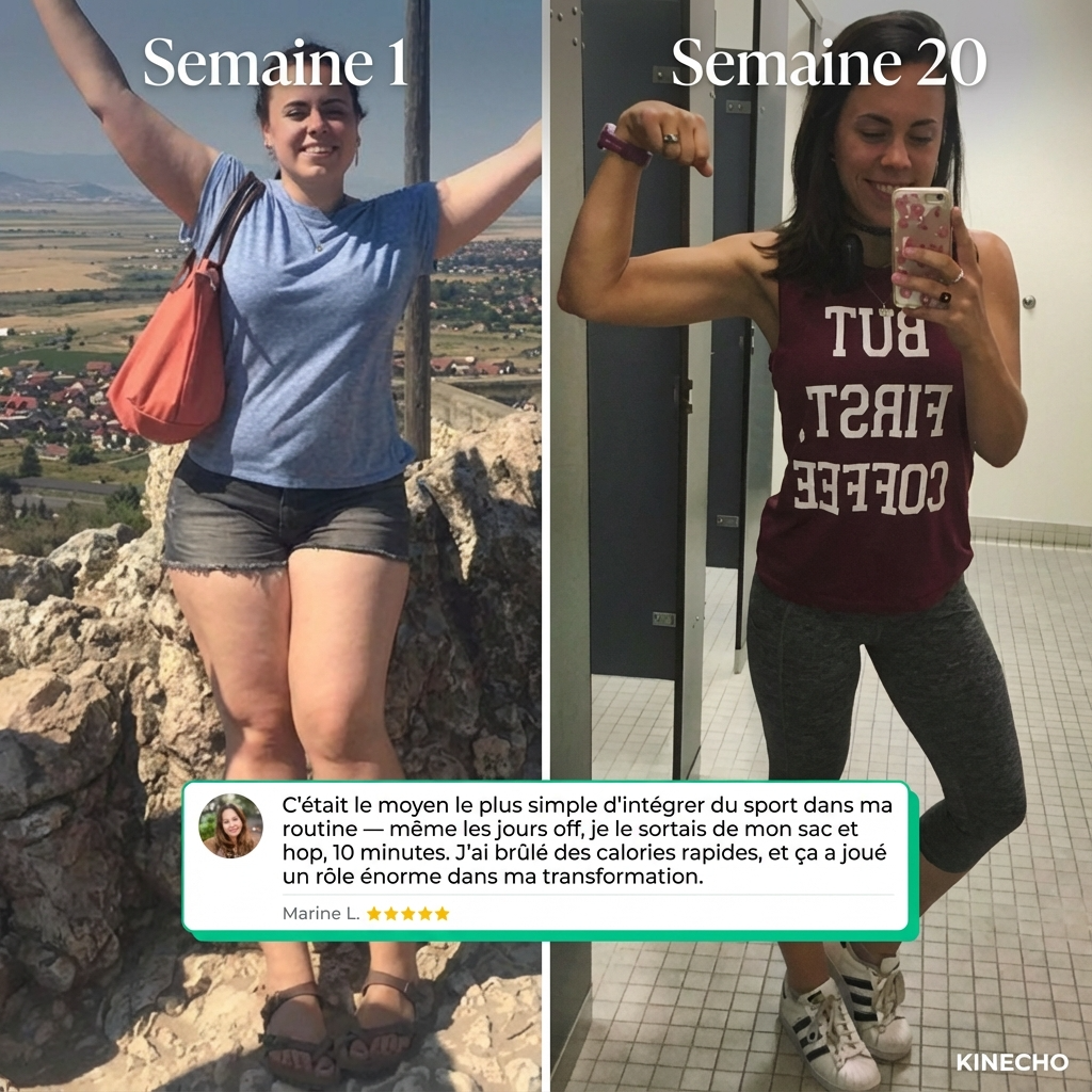 Avec KINECHO, plus de trajet ni de préparation. Elle sort ses poignées de son sac, fait ses 10 minutes, et range tout.
