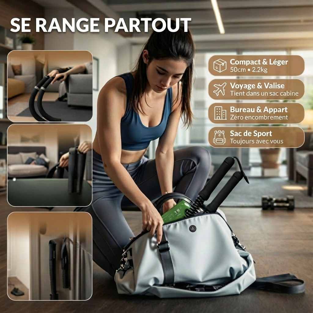 Pas de point d'ancrage à visser au mur. Pas de poids à régler. Pas de tapis obligatoire. Vous le prenez en main, vous commencez. C'est la liberté totale.